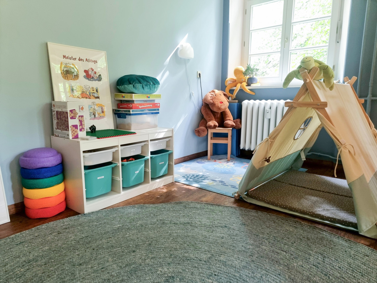 Im größeren Beratungsraum gibt es zusätzlich auch ein Sofa und einen Bereich mit Brettspielen, Spielzeug, Therabeans, Kinetic Sand und vielem mehr.