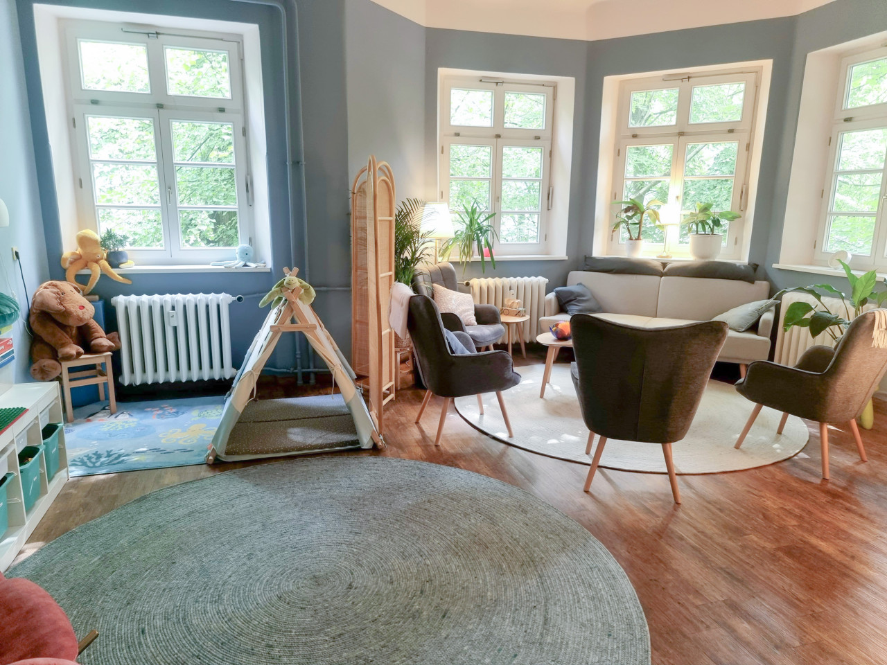 Neben den Beratungsräumen steht außerdem der große Gruppenraum zur Verfügung, welcher z.B. für die Therapiegruppe oder Fortbildungen genutzt werden kann.
